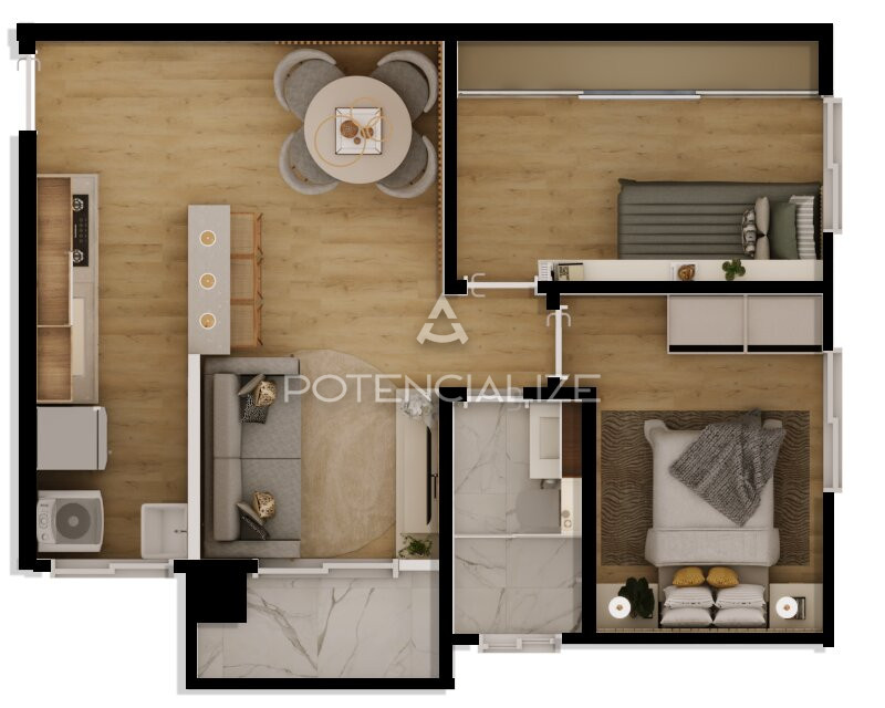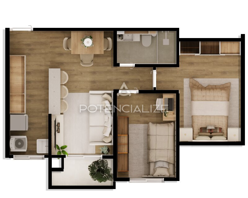 Plantas com 2 dormitórios, sala, sacada, cozinha, banheiro social e área de serviço